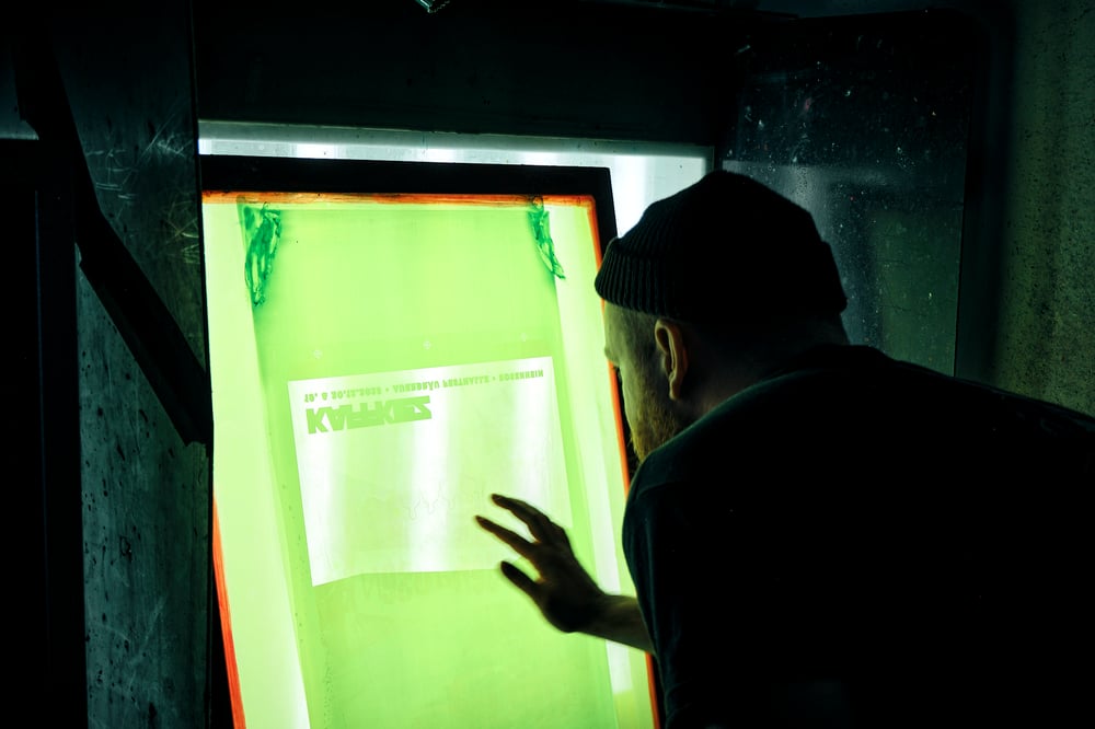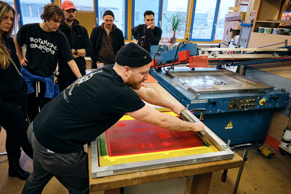 Wir durchlaufen gemeinsam den gesamten Siebdruckprozess. Dazu gehören die Folien- und Motivherstellung, das Beschichten und Belichten des Siebrahmens, das Auswaschen des Motivs, das Mischen der Farben und schließlich der Handsiebdruck deines eigenen Designs.